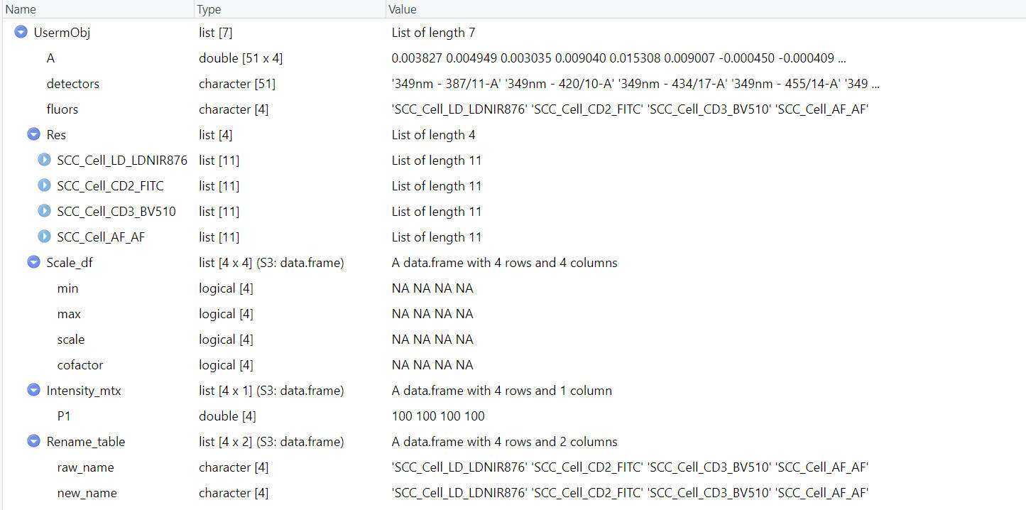 The UsermObj contains all information needed for prediction. The Res item is a list with ResObj of each fluorescence. The Scale_df item contains the scale setting for visualization afterward. It is ok to leave it as NA. Default linear scale will be applied (Options: “Linear”, “Log10”, “Arcsinh”). The Intensity_mtx contains the estimated fluorescence intensities of cell populations. In the example shown here, we have one default populaiton named “P1”. You can modify the name or intensities or add new populations for interactive prediction in Step 3.