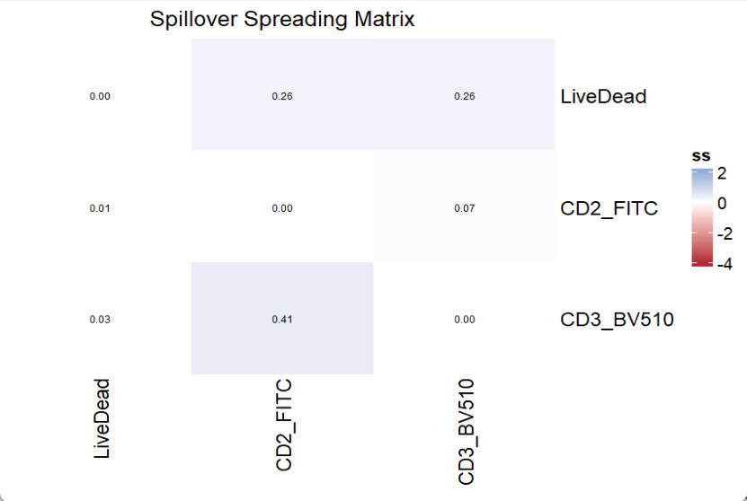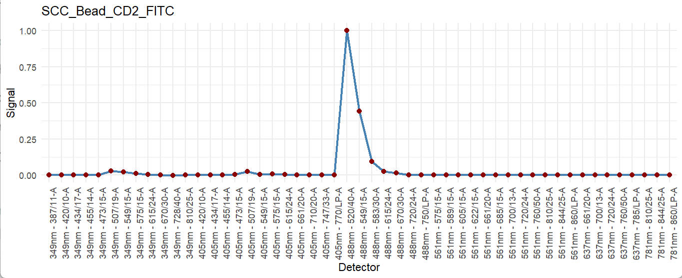 [1] "SCC_Cell_LD_LDNIR876" "SCC_Cell_CD2_FITC" "SCC_Cell_CD3_BV510" "SCC_Cell_AF_AF" Here we select 3 fluorescence plus autofluorescence (AF) to make a simple panel. If you expecting more (>40), just select all of them. Notely, both SCC Cells and Beads are using together. Based on our research, it is ok to use SCC beads for prediction.
