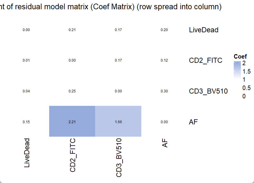 In the Coefficient Matrix, a high coef number indicates high increasing trend of spread from one fluorescence (row) into another fluorescence (column), following the increase of fluorescence intensity. To interpret a high observed coef number and its related severe spread, researchers can use PredOneSpread function to look for the underlying mechanical explanation and potential solutions. A detailed example is provided in another instruction.