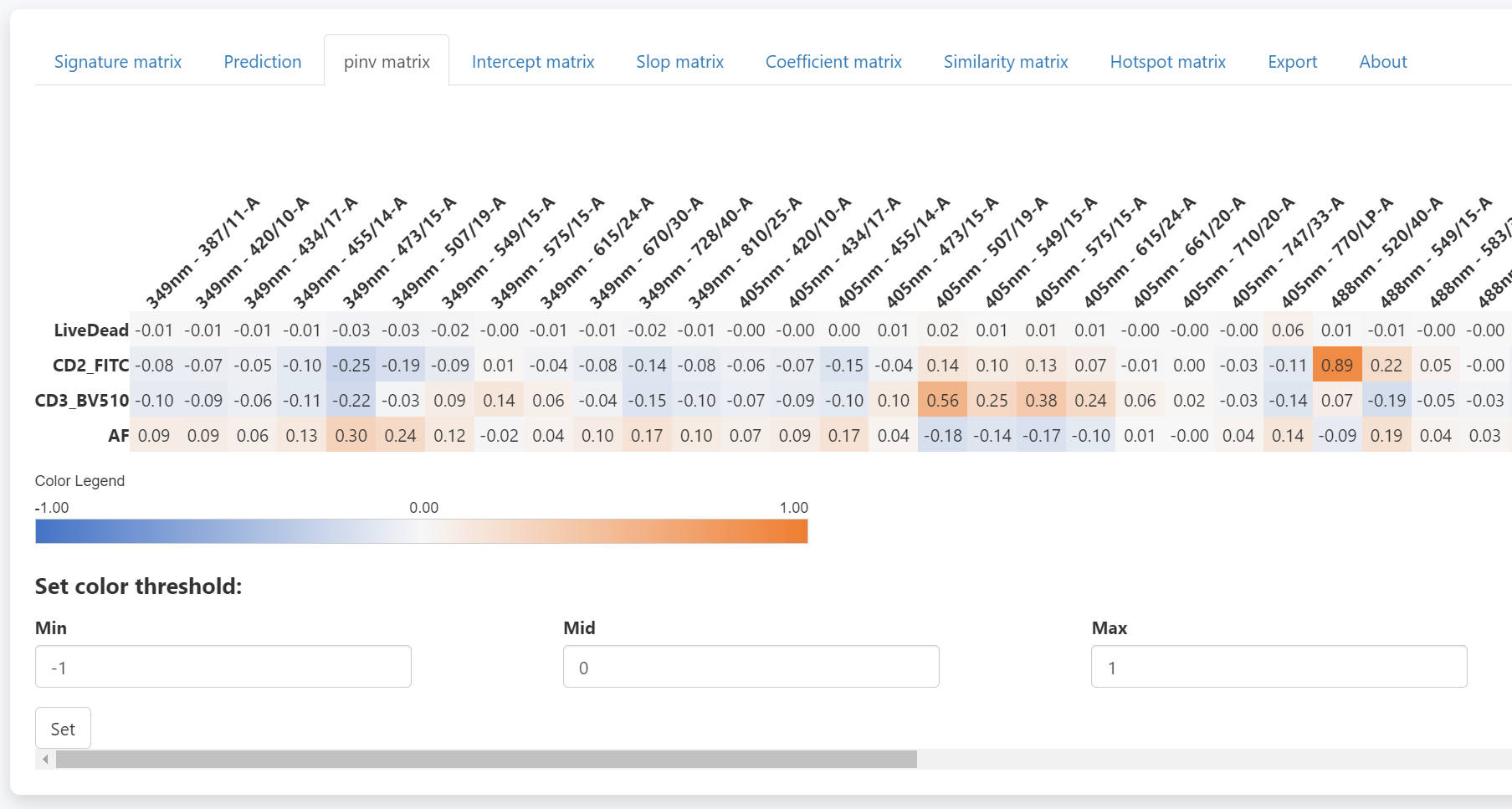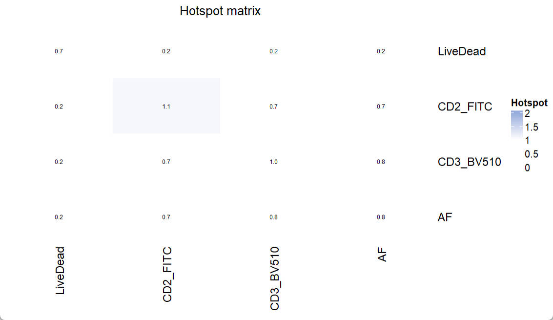 There is no specific threshold for “bad” coef number or “good” coef number. Because the fluorescence intensity also matters and it varies in different settings and conjugated targets. However, this Coef Matrix provides an approach to compare the estimated spread between panels. So that users can choose a panel with less expected spread.