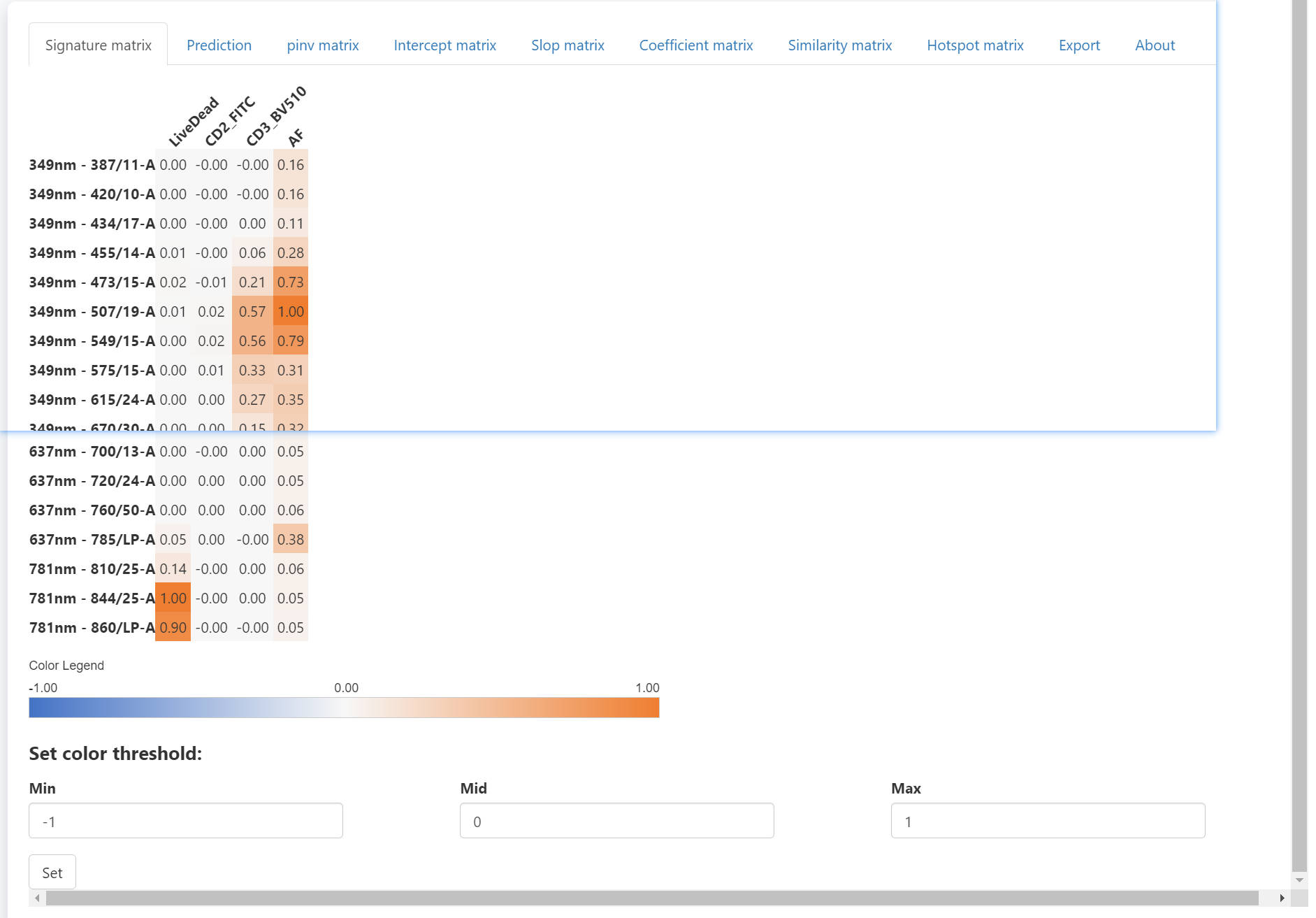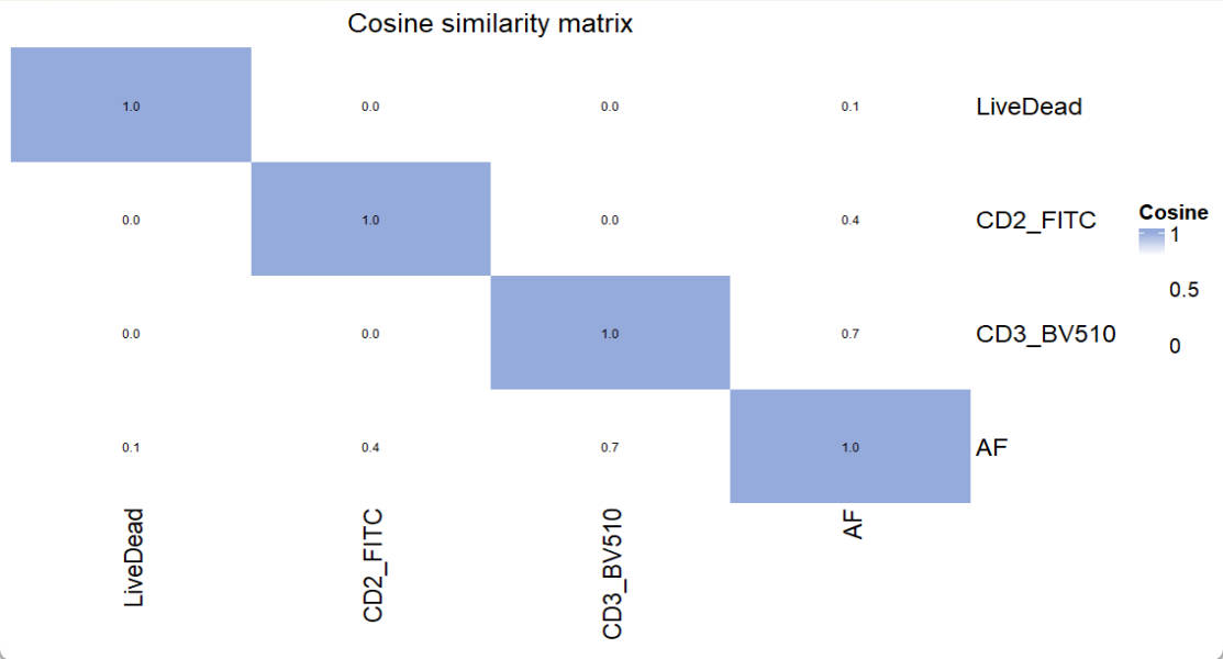 For similarity matrix, a number higher than 0.98 indicates that signals from the pair of fluorescence cannot be well separated. In such case, one of them needs to be replaced by other fluorescence.