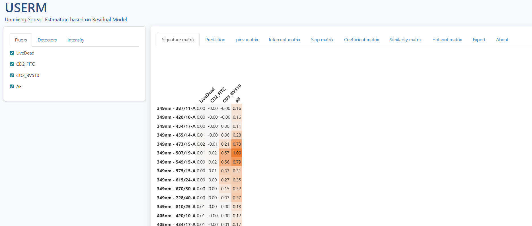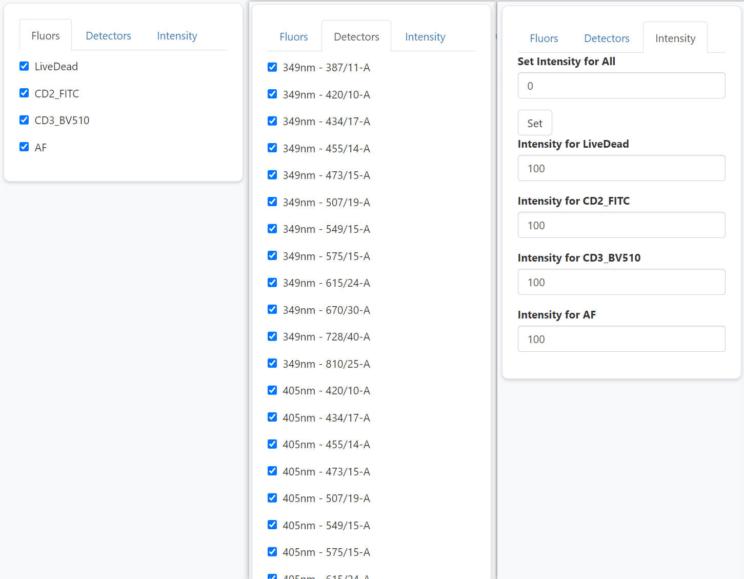 The left panel allows users to interactively select and un-select fluroescence and detectors, and modify intensities. So that users can flexibly explore the impact of fluorescence combination and intensities on the predicted spread. Of note, you can use set-all button to adjust all intensities together. This can be handy when you want to set all of them as 0 except one fluorescence, in which case you are simulating a SCC sample.