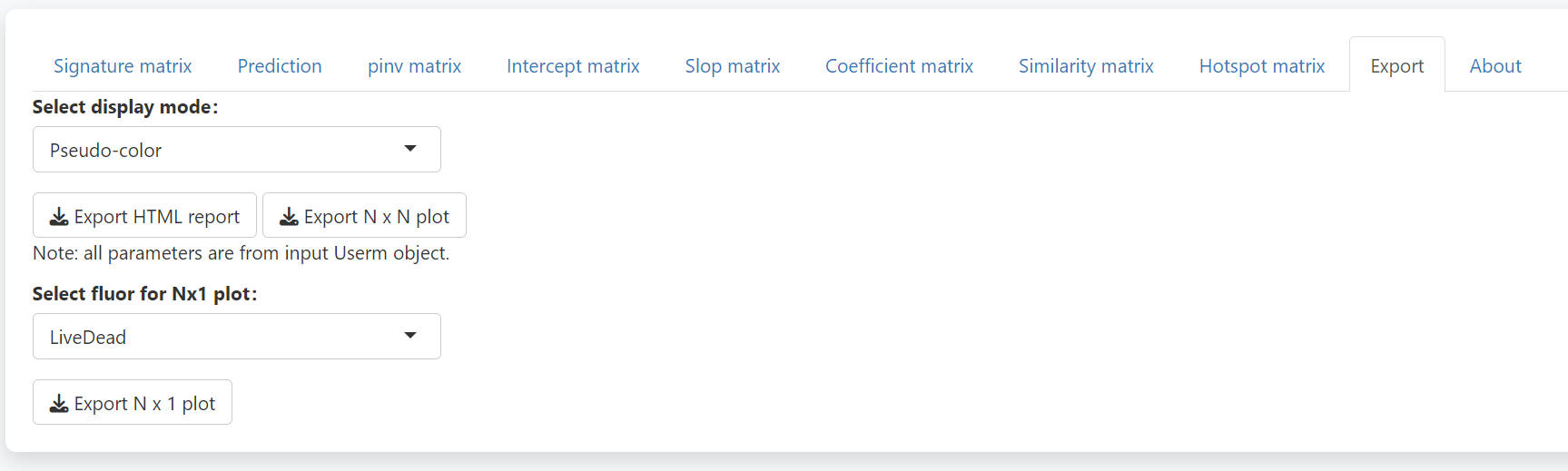 In the export tab, you may directly download a complete report of all the matrixes. You may also export the N-by-N or N-by-1 plots, which could be quite big for a big panel. If you want to plot the N-by-N or N-by-1 plots with custom plot setting, you need to assign corresponding values to the UsermObj[[“Scale_df”]]. Otherwise, default setting will be used.