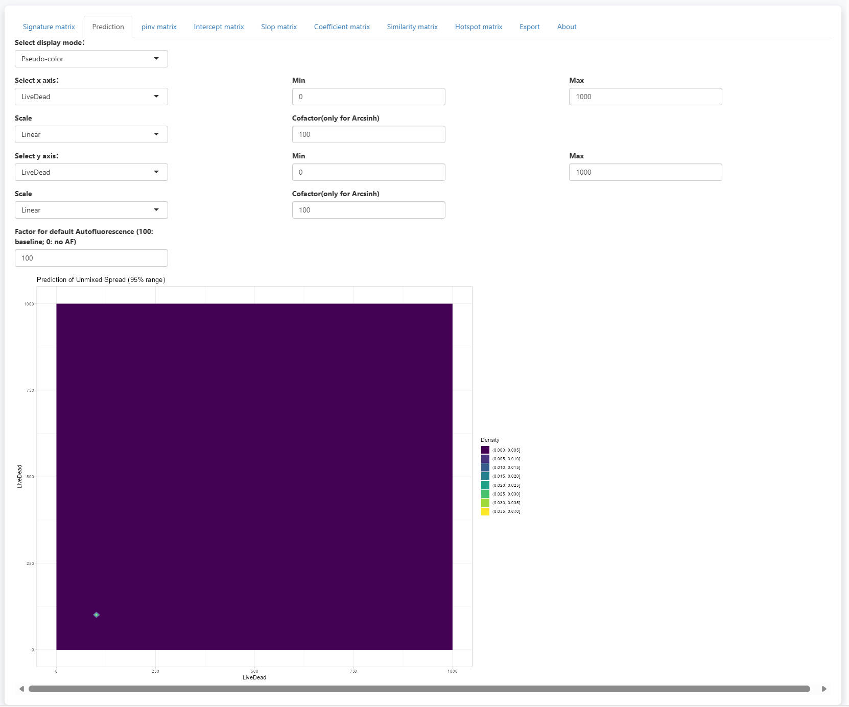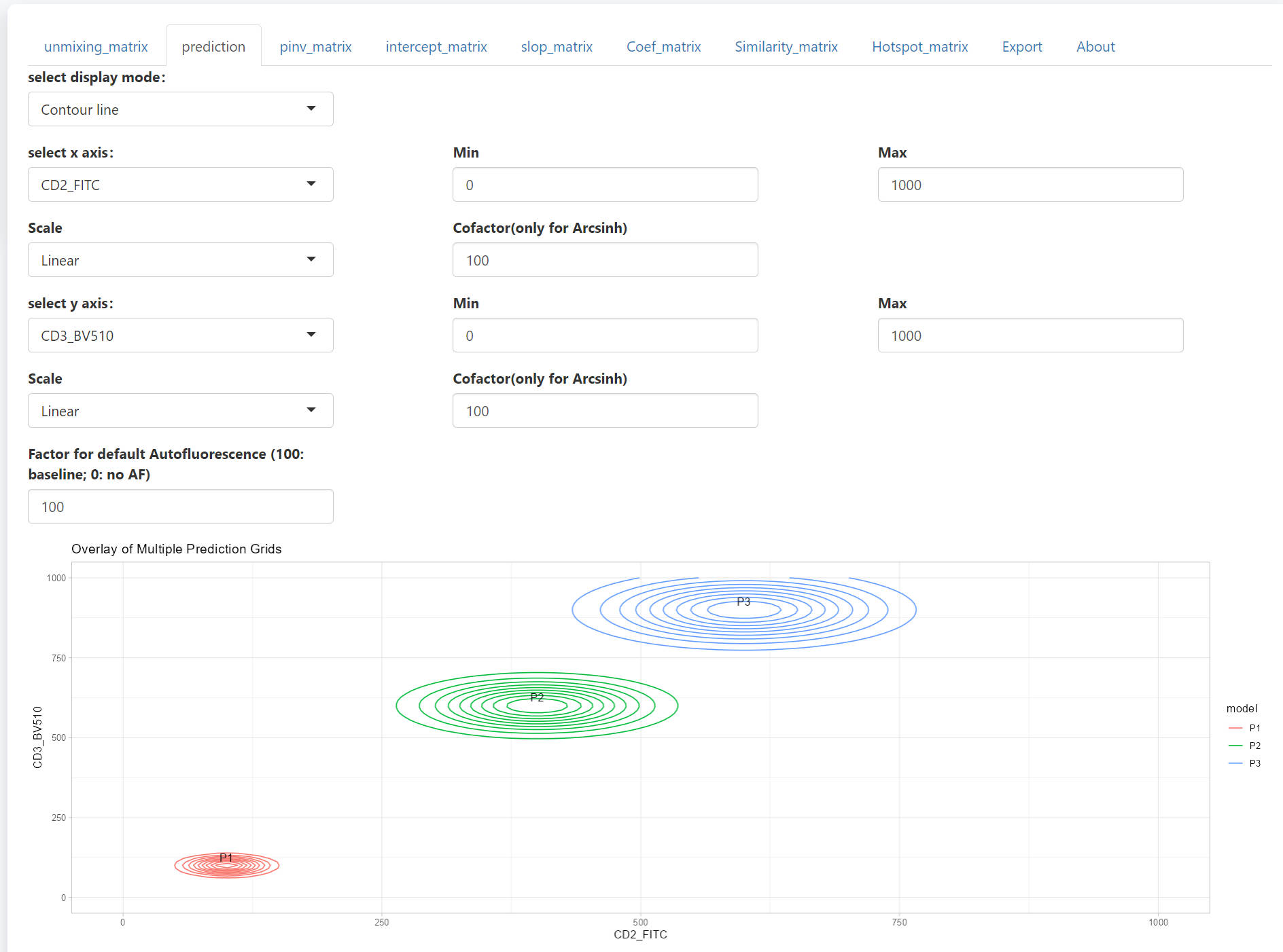 In the prediction tab, you will see a scatter plot visualizing the 95% range of predicted spread. Two display mode is supported: Pseudo-color and Counter-line. It allows the selection of fluorescence for x and y axes. You can also adjsut the display limis of the axes. Scale is support with Linear, Log10 and Arcsinh options. For Arcsinh, users need to set a cofactor.