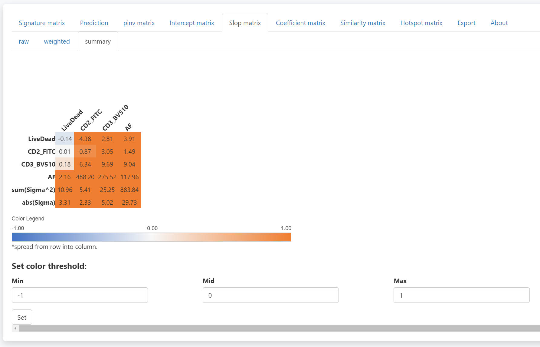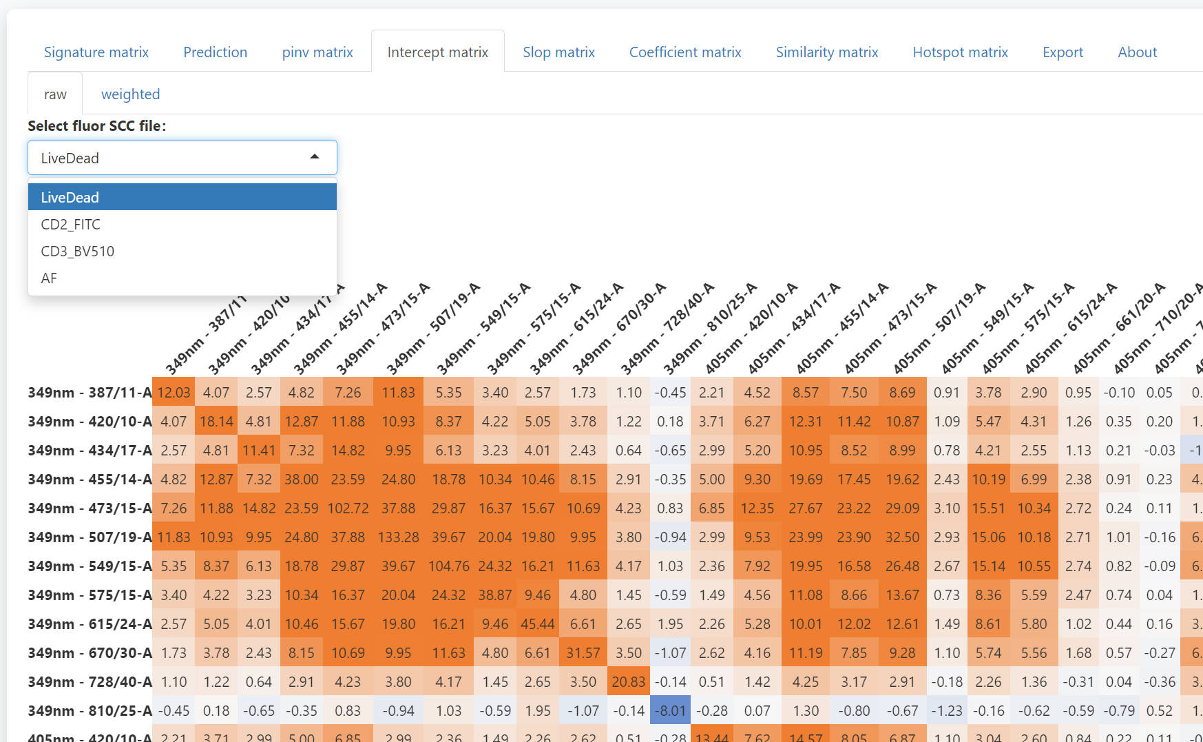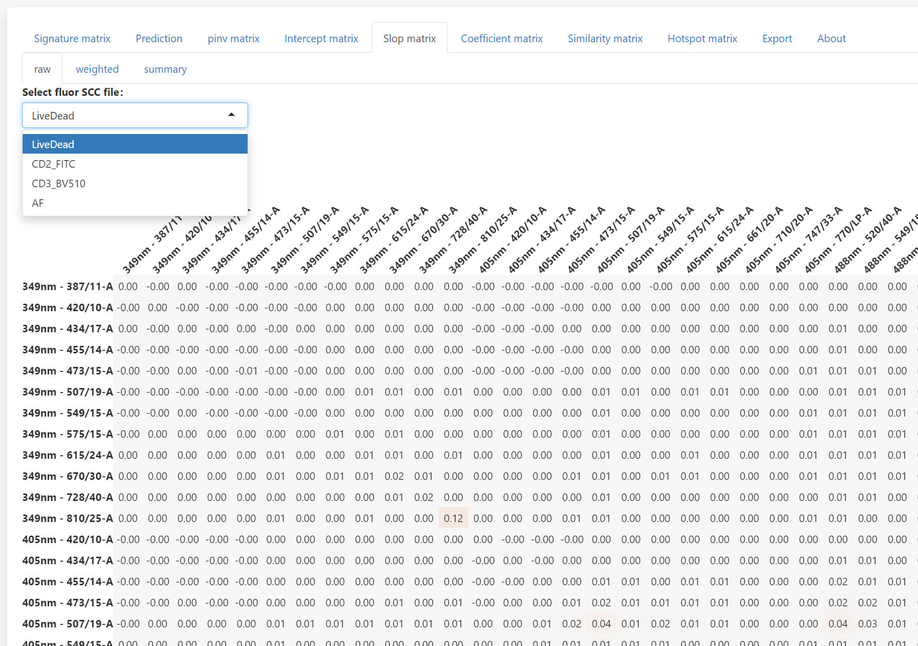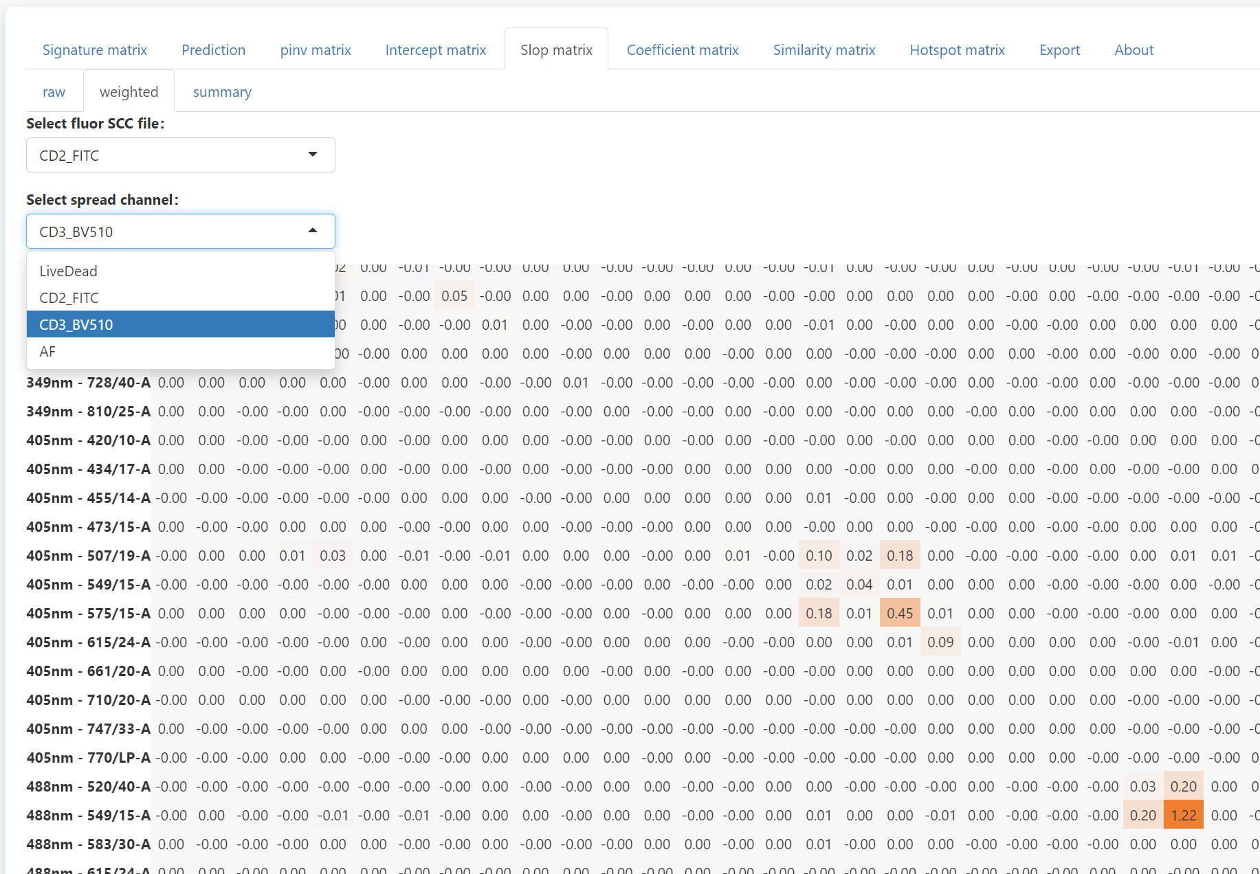 To check the detail of each number summary slop matrix, you can use the weighted tab. Select the fluorescence and the channels to be spread into, you can check the weighted slop matrix. The sum of the weighted slop matrix will be the corresponding value in the summary slop matrix. With the weighted slop matrix, you can explain why a severe spread occurs.
