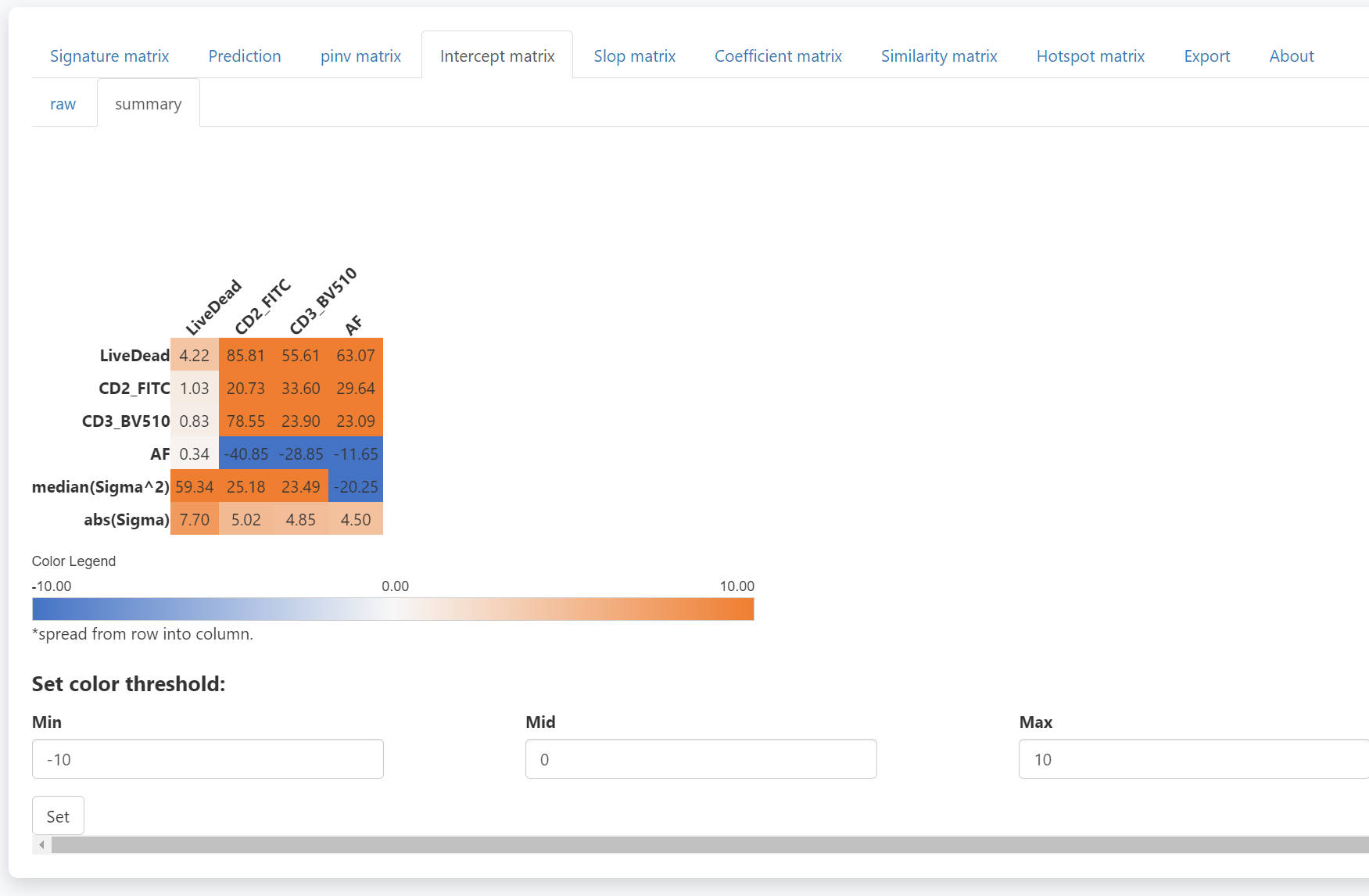 The right panel have some tabs. The signature matrix contains all normalized signatures. If you want to adjust the color threshold, you may scroll down to the bottom and set new color threshold. There are tow ways to use different color palette. First, you can get the matrix with mathods described in Step1 or Step4, and visualize with the Vis_Mtx function, which is also described in Step4. Another method is that you can directly copy and paste the whole matrix into Excel and apply distinct color palette in Excel or other software.