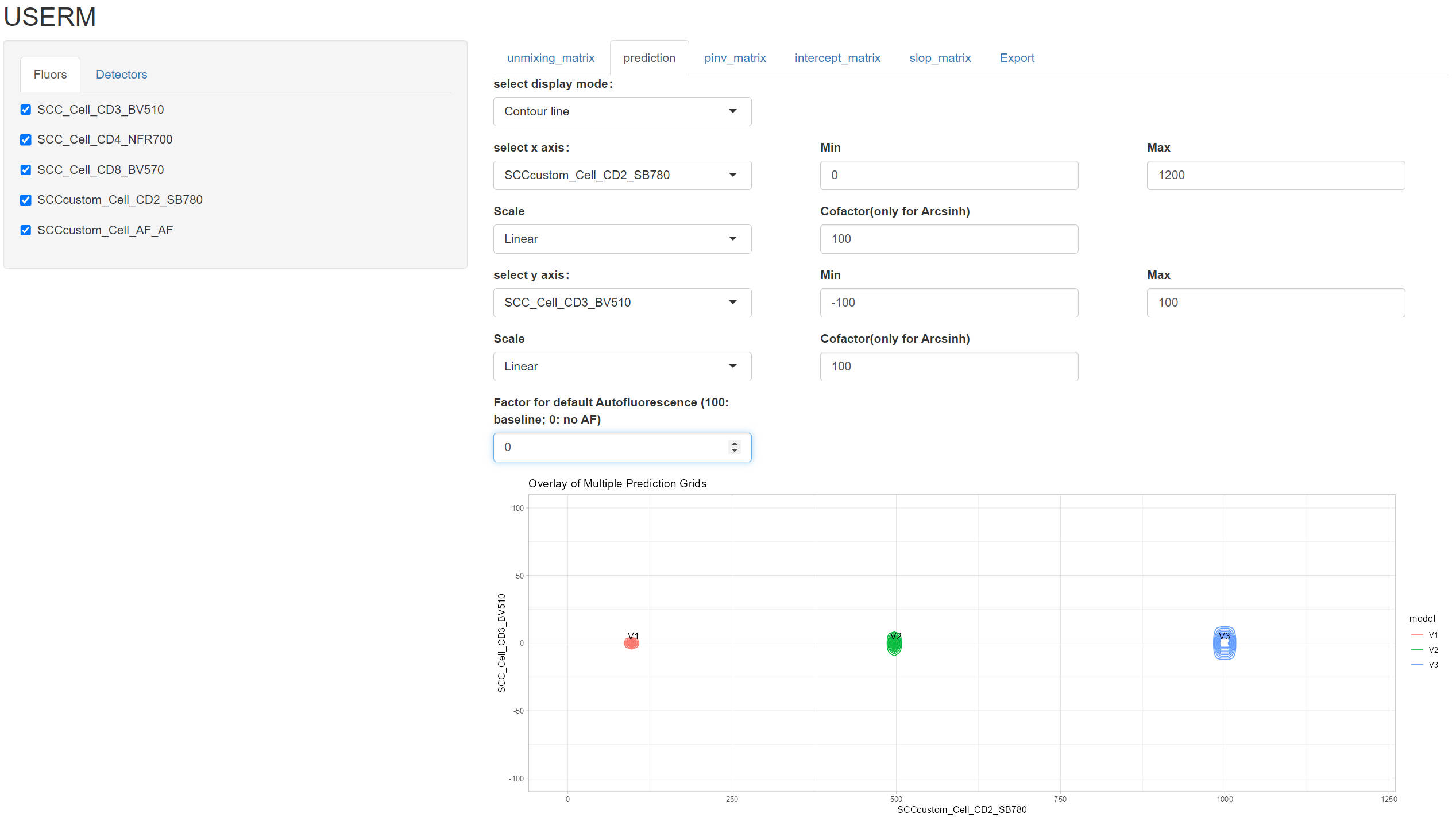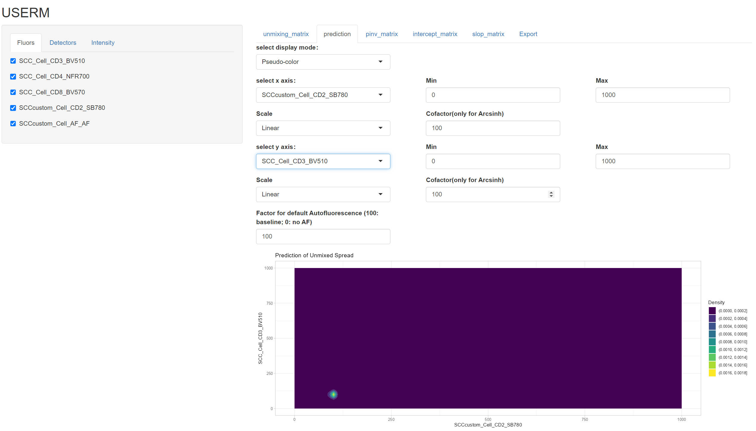 The USERM supports predicting spread for unmixed spectral flow cytometry data, which helps for panel design and interpratation of unmixed results. There are over 200 built-in Single-color controls (SCCs) provided by the USERM. However, users can also apply USERM on their own SCCs. This helps when users need specific fluorescence not provided by USERM, or when they are using instruments not included in the USERM.