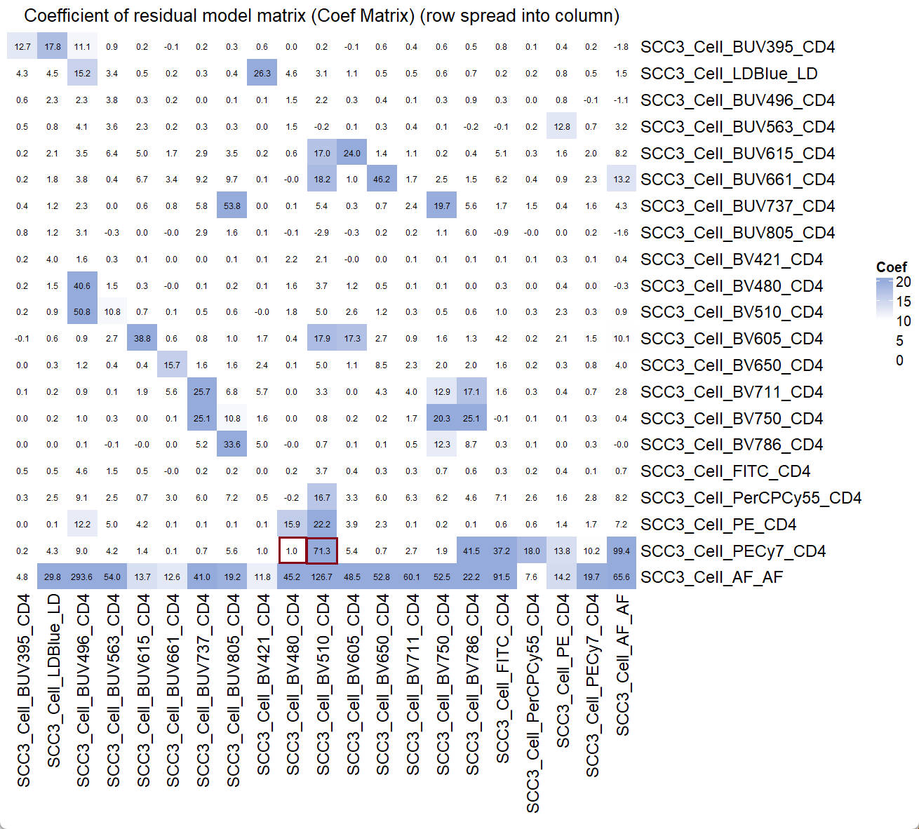 From the plot, it is clear that the PECy7 barely spread into BV480, compared to that for BV510. These observation verify what we find in the coef matrix.