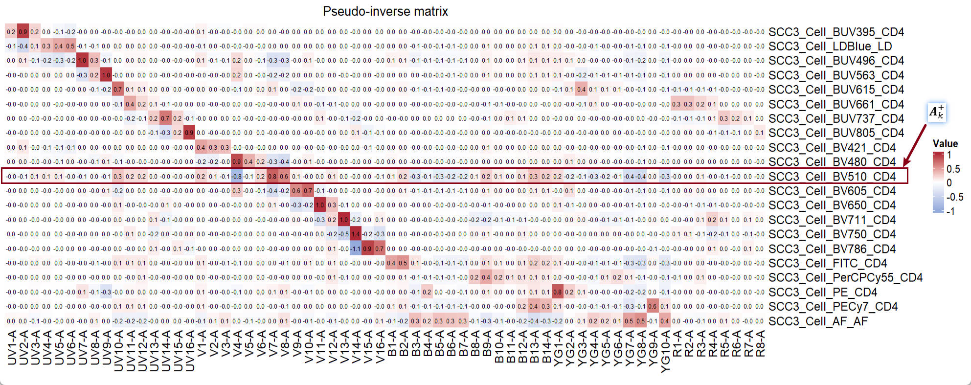 In conclusion, the high spread from fluorescence h (PECy7) into fluorescence k (BV510) is related to the circled value in the peseudo-inverse matrix and the slop matrix.