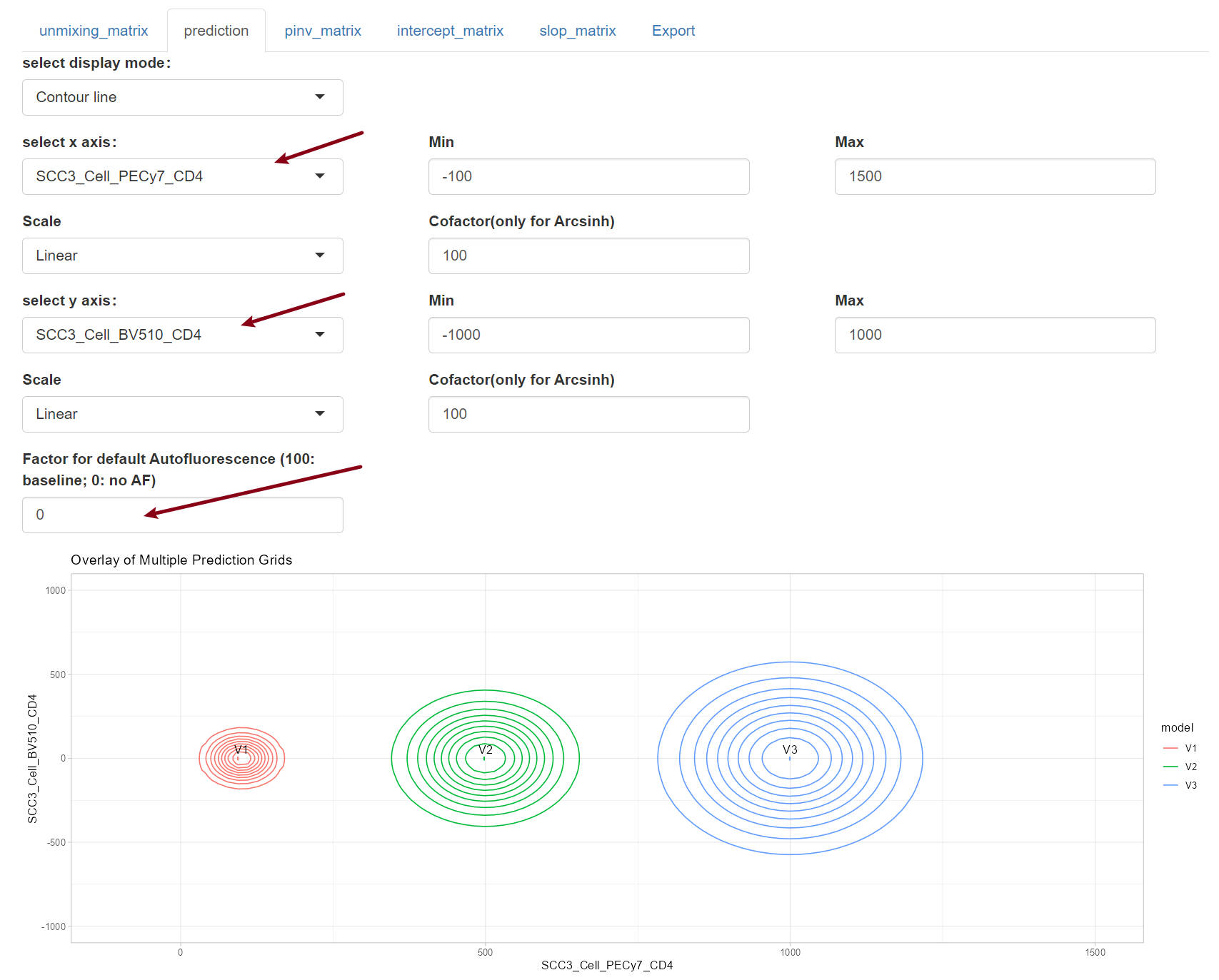 In another word, it is not only influenced by the overall signature matrix, but also by the linear relationship between the covariance among residual signals of detector B12-A, B13-A, B14-A, and YG10-A and the intensity of fluorescence h (PECy7).