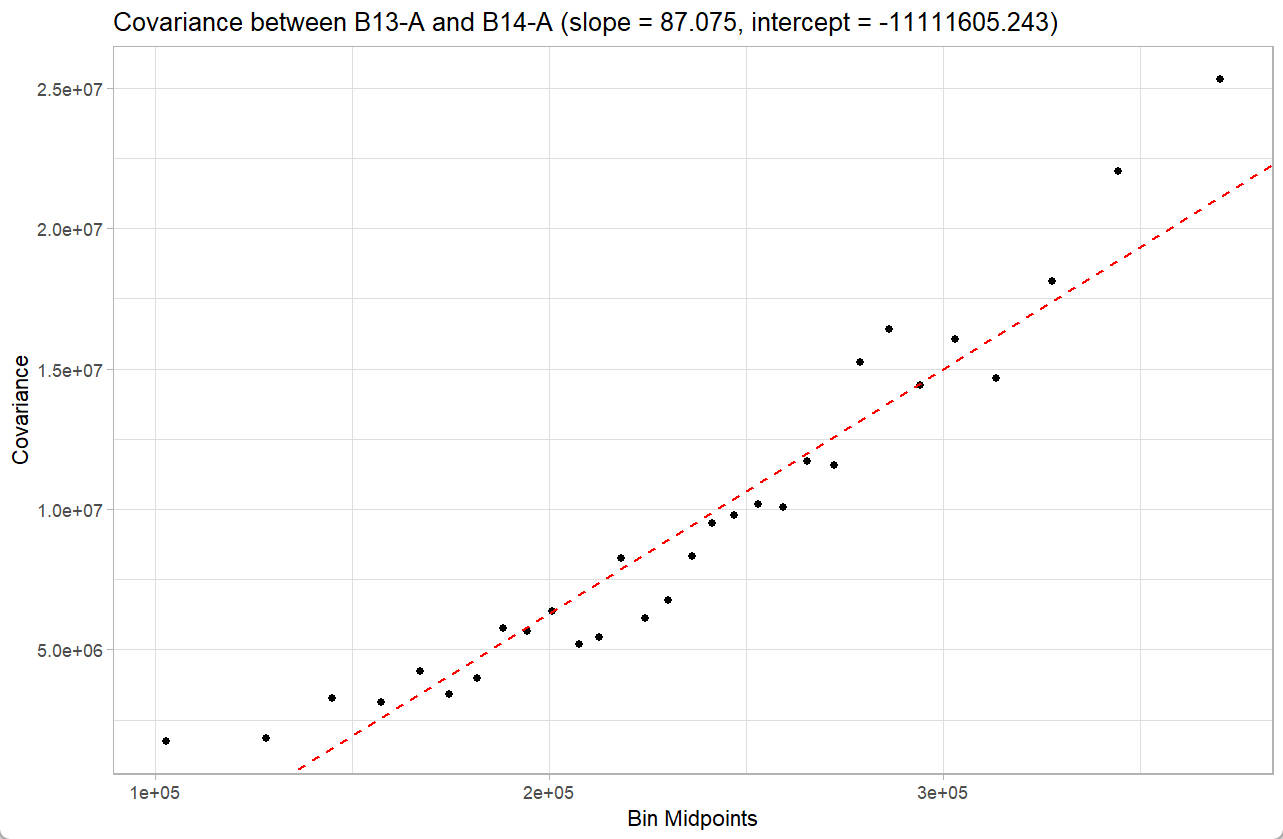 We can visualized the linear relationship between the covariance of B13-A and B14-A versus the fluorescence intensity of the fluorescence h (PECy7):
