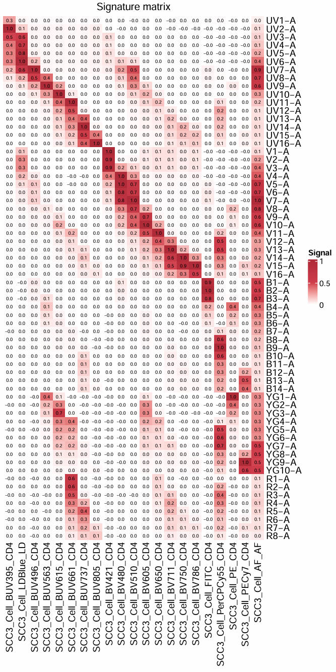 We can first visualize the signature matrix, this is simply the signatures of all fluorescence in the panel.