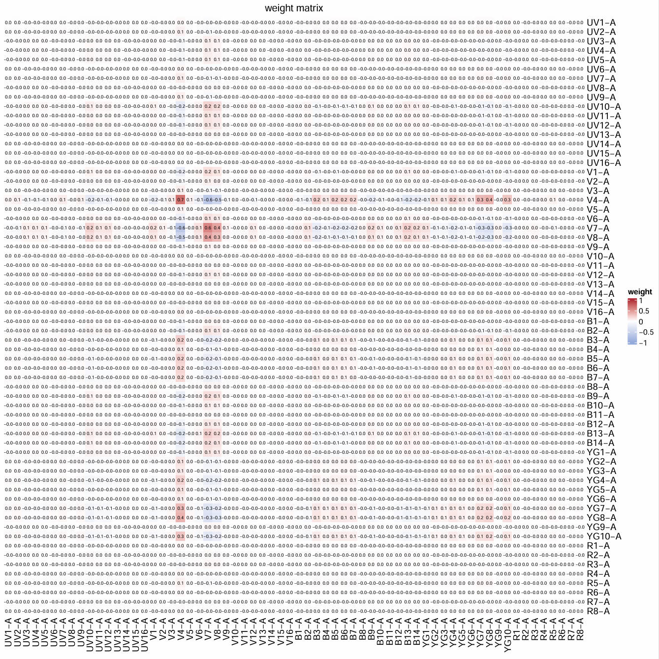Vis_Mtx(mat = weight_mtx,mincolor = "#95ABDB",midcolor = "white", maxcolor = "#B02B38",