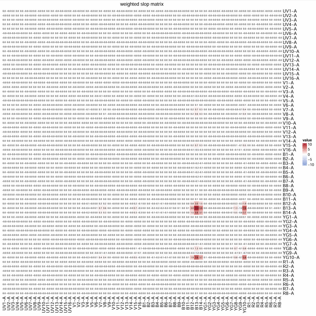 Vis_Mtx(mat = slop_mtx,mincolor = "#95ABDB",midcolor = "white", maxcolor = "#B02B38",